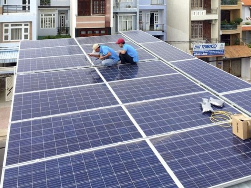 - Tấm pin được đưa lên mái bằng thang nâng hoặc ròng rọc để đảm bảo an toàn trong quá trình thi công.