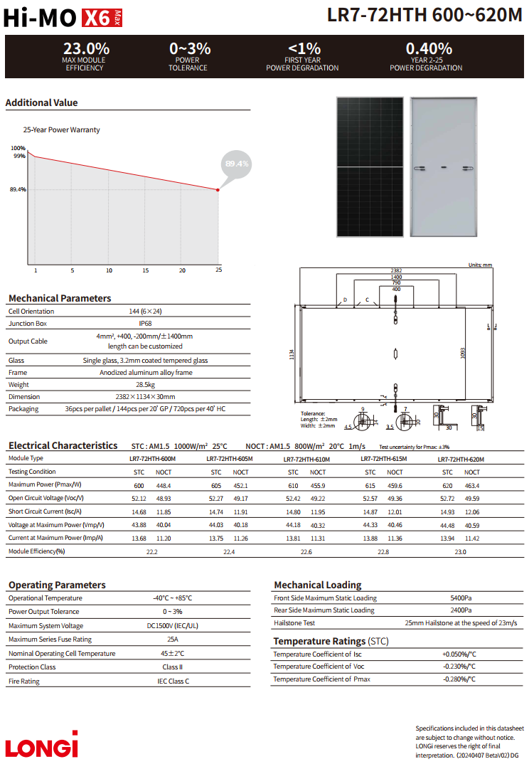 Thông số kỹ thuật chi tiết Tấm Pin Năng Lượng Mặt Trời Longi Solar 615W Hi-MO X7 2 Mặt Kính