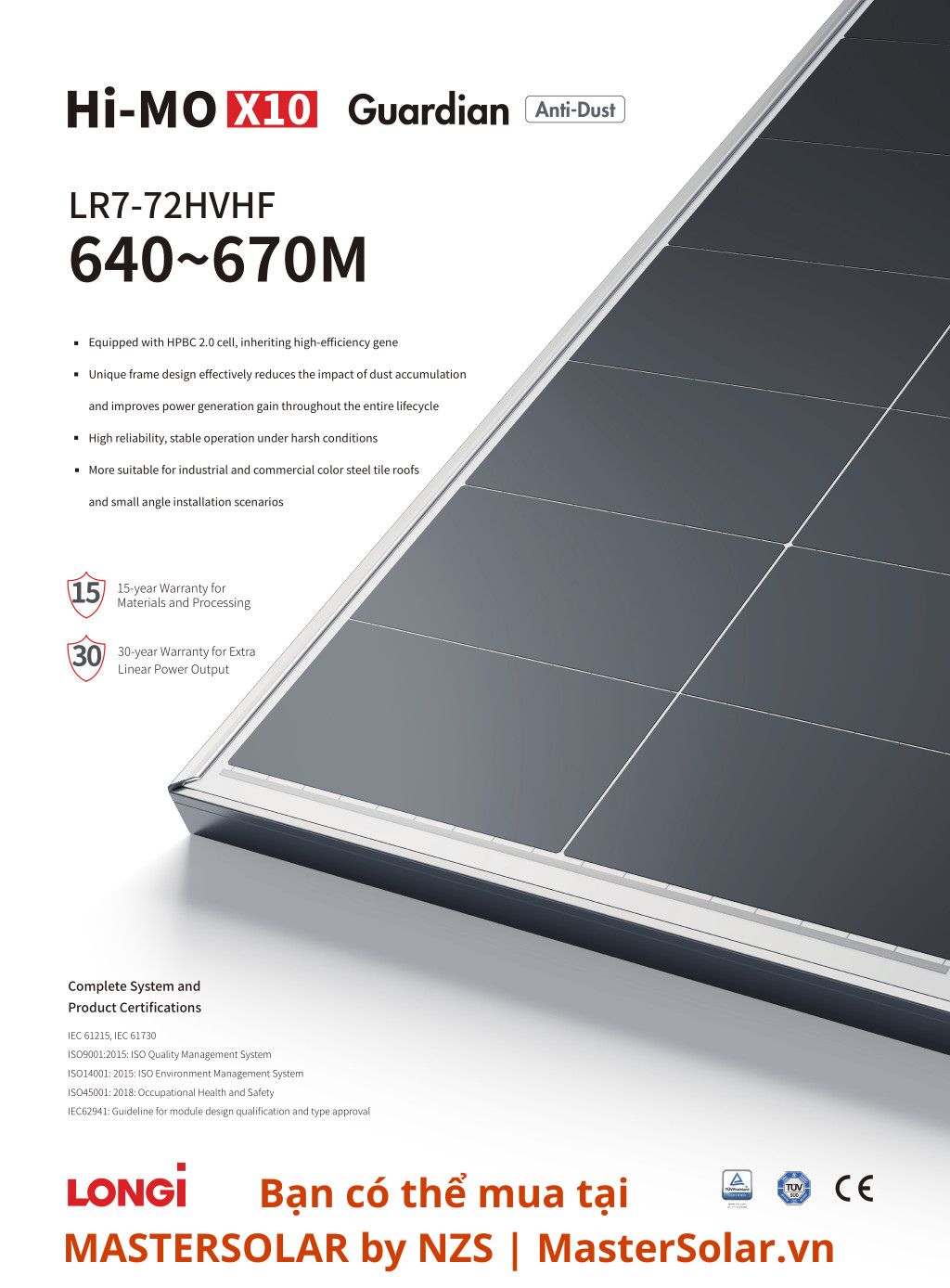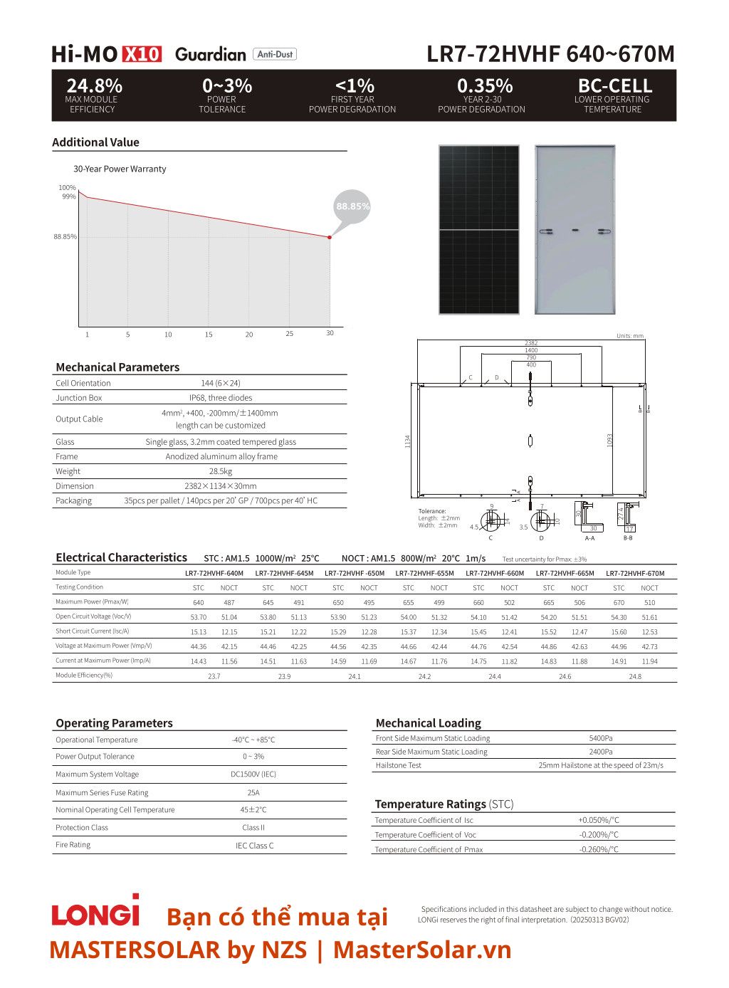 | Bảo hành | 15 năm sản phẩm, 30 năm hiệu suất (≥87.4% sau 30 năm) |